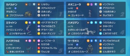 SVシングルシーズン18で使用して最終12位だった構築。 TN:あんのういも コンセプト 攻めに優れた補完で崩せない構築を作らない 構築経緯 ■ - jiri_Pokemonのブログ 竜王戦予選で2位だった方のチョッキミライドン+鉢巻パオジアンが攻めの補完に優れており、…